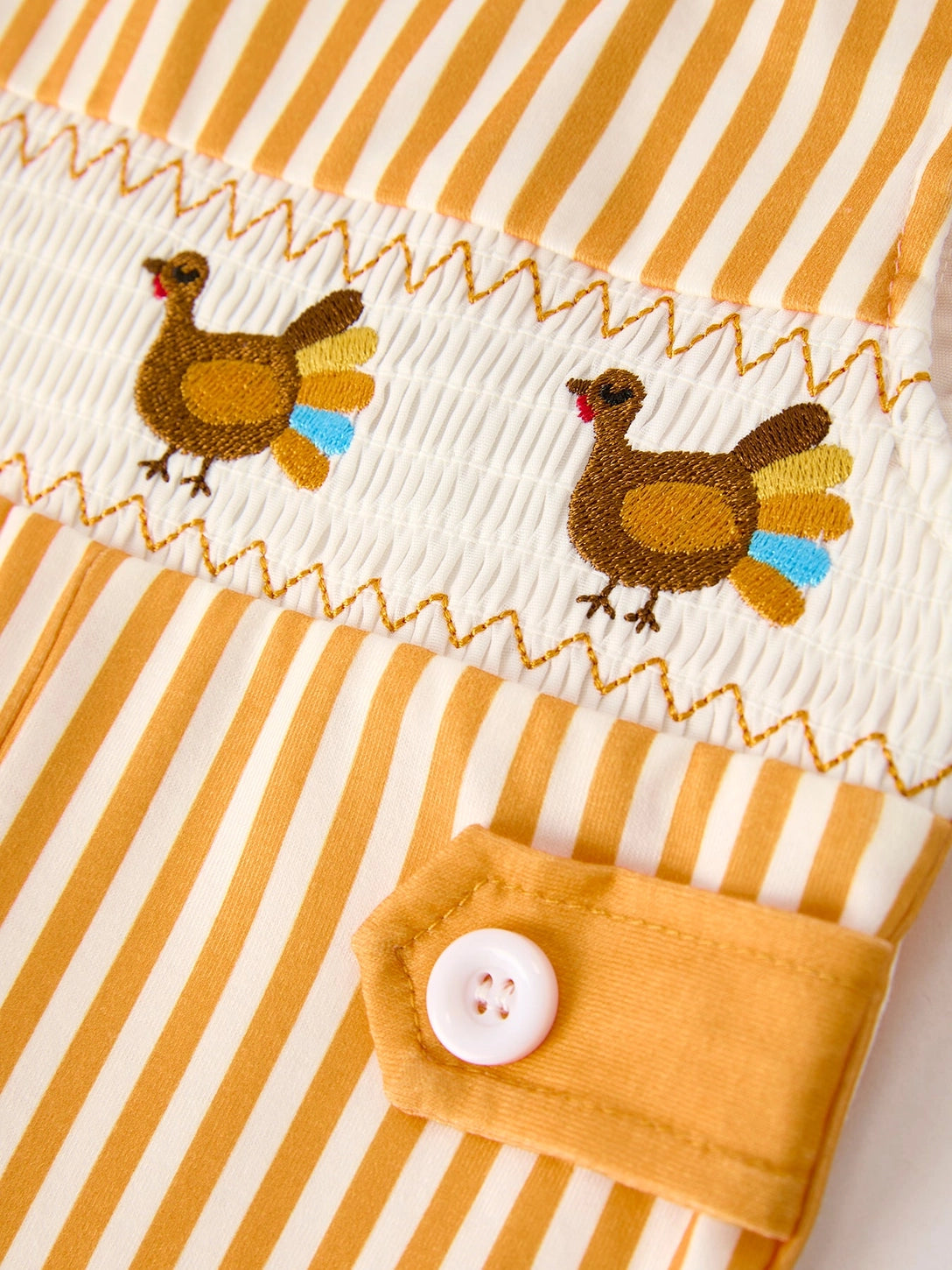 Fall Thanksgiving Smock Embroidered Orange Stripes Boys Romper