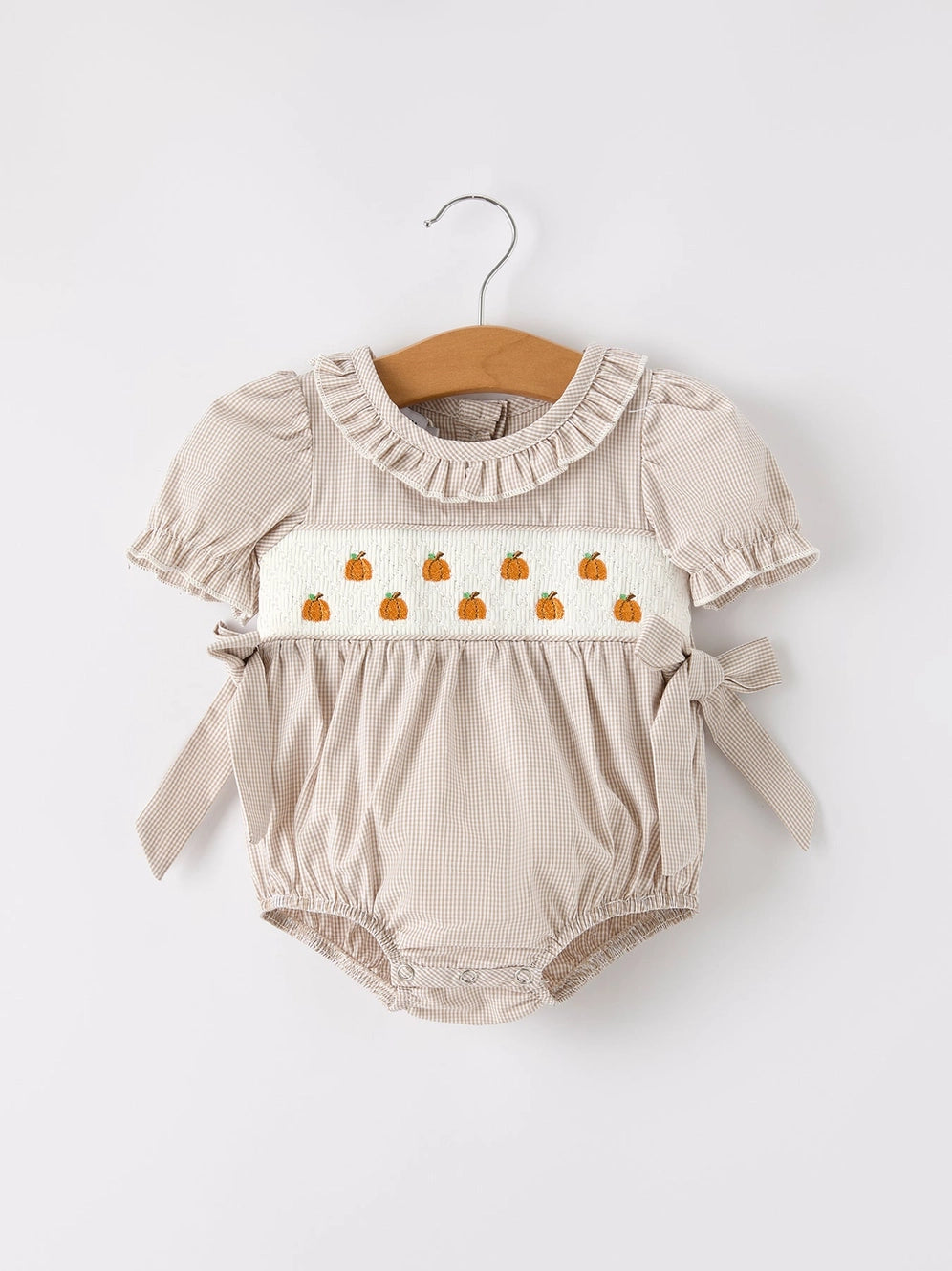 Halloween & Thanksgiving Pumpkin Embroidery Smock Plaid Baby Girl Romper